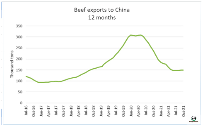 2019年底至2020年上半年期間,澳大利亞對中國牛肉出口量從每年略高于30萬噸的高峰急劇下降后,自去年6月以來的12個月里,澳大利亞對中國牛肉出口量穩定在15萬噸左右。出口量為30萬噸時,對中國出口量在澳大利亞出口中占25%,目前出口占比降至16-17%。