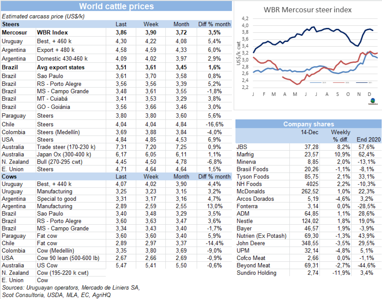 烏拉圭主要的屠宰包裝工廠決定在今年的剩余幾天減少活動,以應對供應收縮。美麗華已決定7廠于圣誕節前停工兩周,暫停申請許可證,而Marfrig也將在Salto廠停工,暫停申請許可證,盡管停工不超過10天。