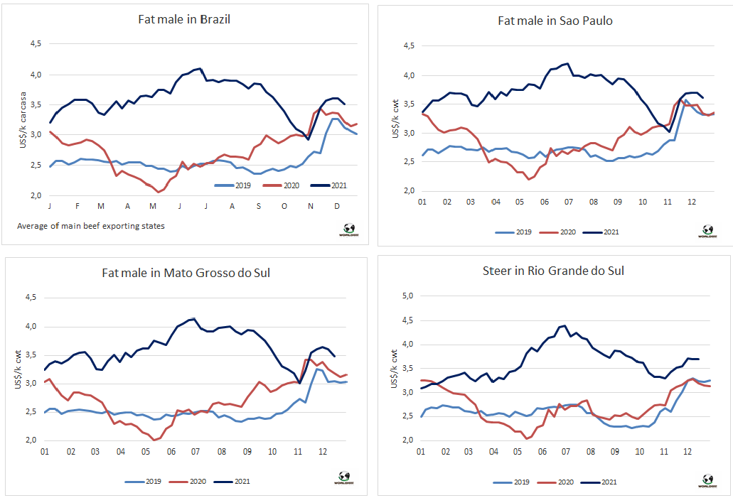 育肥牛價格本周全面下跌。主要原因是12月上半月國內市場表現不佳,和無法出口中國。唯一牛價沒有下行的地區是南里奧格蘭德州,南馬托格羅索州和馬托格羅索州牛價有持續下跌,育肥牛價格較上周下跌了7-8雷亞爾/15公斤分別下跌至297.5雷亞爾/15公斤和291.5雷亞爾/15公斤。圣保羅州牛價下跌了4.5雷亞爾/15公斤,至308.5雷亞爾/15公斤。圣保羅州預定時間在8天左右,工廠的采購價格仍保持下行壓力。包裝工廠和分銷商的牛肉庫存都很大。