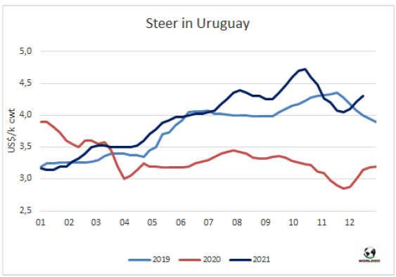 本周南方共同市場閹牛價格指數在連續五周的上漲之后下跌,本周下跌了4美分至3.86美元/公斤。該指數下跌的主要原因是巴西育肥牛雷亞爾價格下滑。此外,巴西雷亞爾兌美元匯率下跌了0.9%,巴西主要出口州育肥牛價格本周下降了10美分至3.51美元/公斤,與其他地區相比,巴西的價格拉開了與其他地區牛價的差距。相反烏拉圭市場堅挺,特種重型閹牛貿易參考價4.3美元/公斤。阿根廷和巴拉圭市場保持穩定,阿根廷出口閹牛參考價在4.58美元/公斤,巴拉圭參考價3.8美元/公斤。