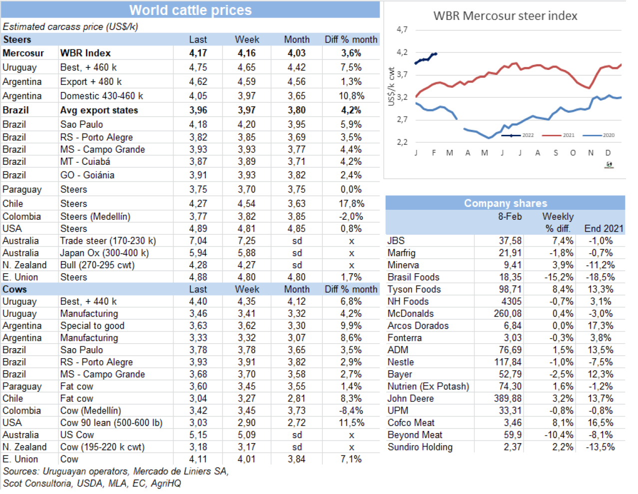 本周南方共同市場(chǎng)閹牛價(jià)格指數(shù)上漲了1美分至4.17美元/公斤。不同國(guó)家參考價(jià)均保持穩(wěn)定,盡管巴西方面育肥牛價(jià)格有輕微下調(diào),下跌了1美分至3.96美元/公斤。其他三個(gè)國(guó)家牛家均為上漲趨勢(shì),烏拉圭牛價(jià)目前是南美最高,本周上漲了10美分,達(dá)4.75美元/公斤的新紀(jì)錄。阿根廷出口閹牛價(jià)格上漲3美分至4.62美元/公斤,含出口稅。巴拉圭方面供應(yīng)減少,待宰公牛價(jià)格上漲了5美分至3.75美元/公斤。