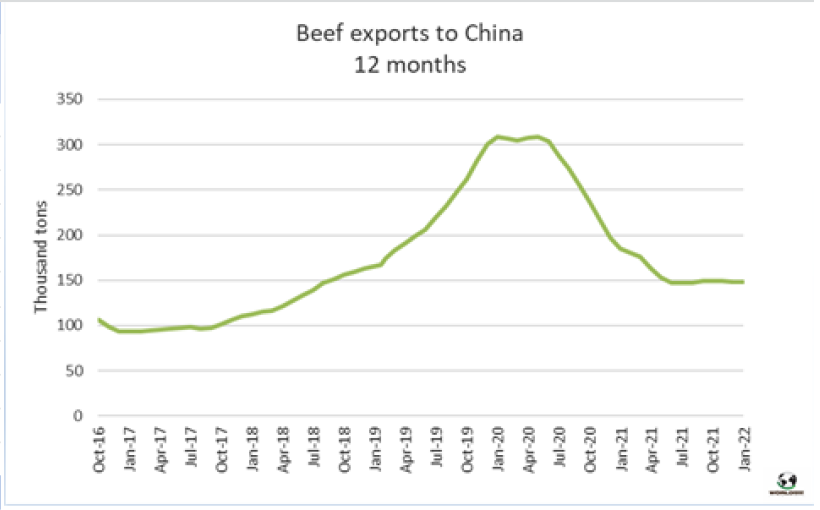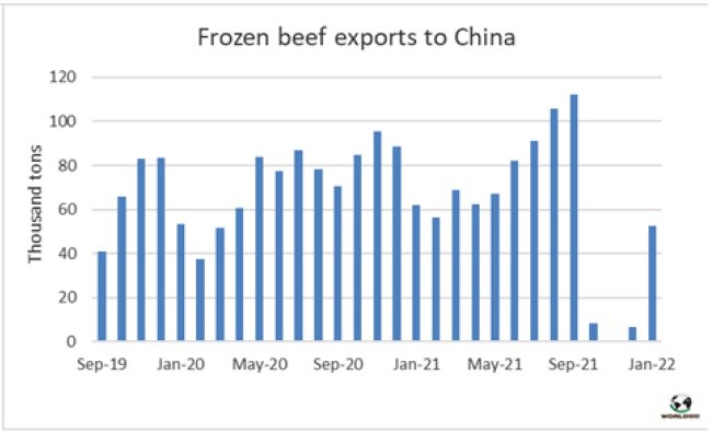1月烏拉圭對(duì)中國(guó)的平均出口價(jià)格5931美元/噸,比12月的平均價(jià)格低43美元。烏拉圭對(duì)中國(guó)平均出口額連續(xù)11個(gè)月的增長(zhǎng)畫(huà)上句號(hào)。2022年1月的平均價(jià)格同比增長(zhǎng)了49%,這是由于不同部位肉價(jià)格的上漲,去骨部位肉相對(duì)于帶骨牛肉的占比更大。今年1月,烏拉圭對(duì)中國(guó)牛肉出口量占總出口量的76%,其中冷凍牛肉對(duì)中國(guó)出口量占總冷凍牛肉出口量的82%。根據(jù)海關(guān)出口數(shù)據(jù),1月烏拉圭牛肉出口量33167噸,平均價(jià)格為6455美元/噸。盡管出口量較去年12月的峰值下降了20%,但仍比2021年1月高27%。