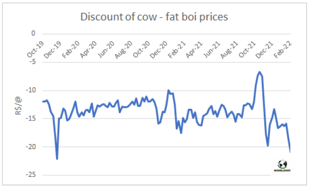 由于對(duì)中國(guó)出口的緊迫需求使可以出口到中國(guó)的30月齡以下的小公牛價(jià)格與母牛價(jià)格的價(jià)差拉大。圣保羅州可以對(duì)中國(guó)出口的小公牛采購(gòu)價(jià)要高出15雷亞爾/15公斤。反過(guò)來(lái),育肥母牛與育肥公牛之間的價(jià)格差擴(kuò)大到20雷亞爾/15公斤,這是自2019年11月以來(lái)的最大差距,當(dāng)時(shí)對(duì)中國(guó)出口也有非常強(qiáng)烈的需求。相反,當(dāng)巴西暫停對(duì)中國(guó)的出口時(shí),母牛與公牛之間的價(jià)格差距縮小到8雷亞爾/15公斤。一周內(nèi),育肥牛價(jià)格小幅下調(diào),而批發(fā)市場(chǎng)后部位肉價(jià)格保持穩(wěn)定,而前部位肉價(jià)格則有所上漲。