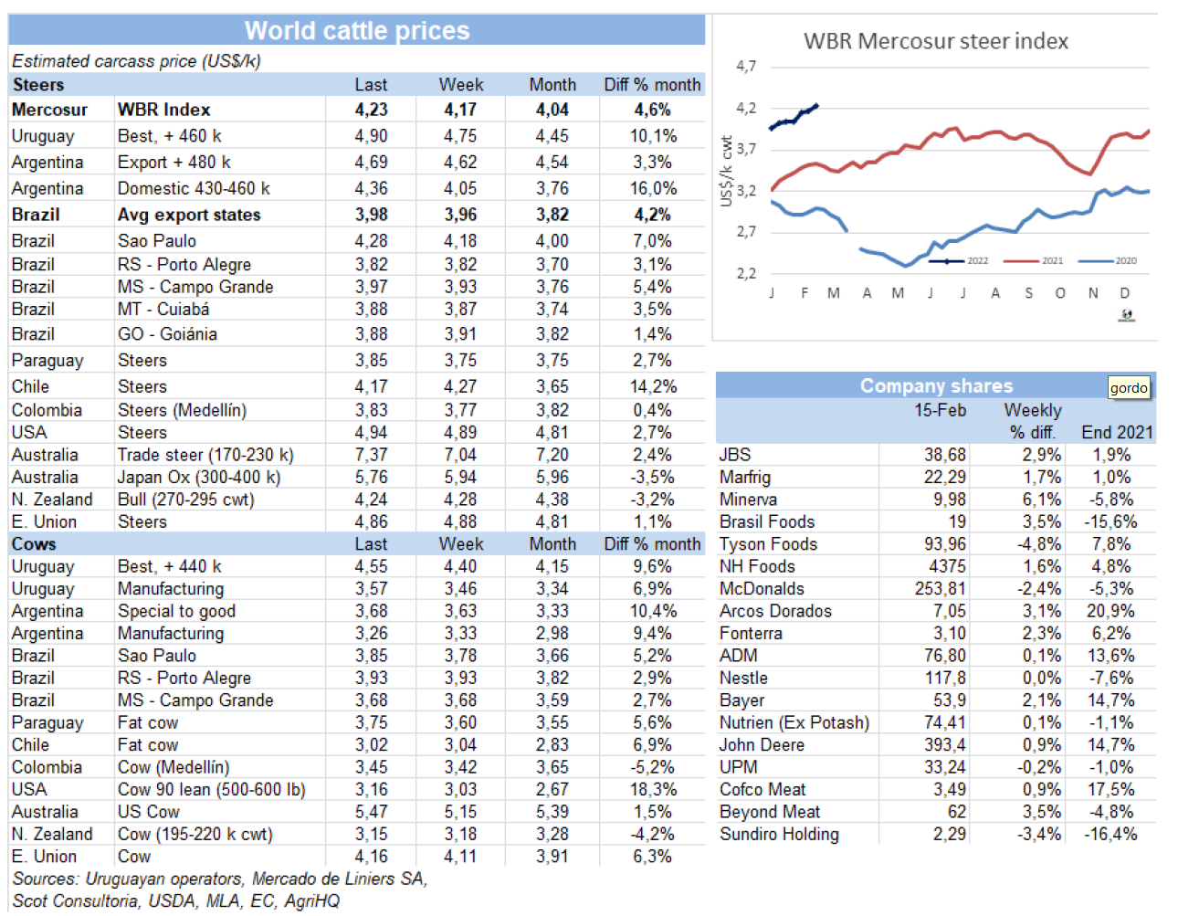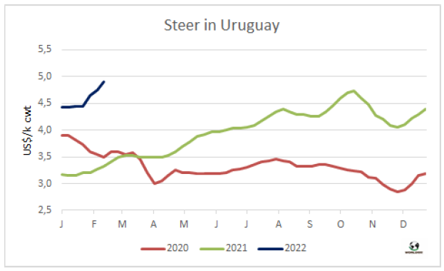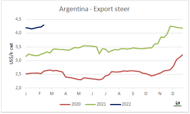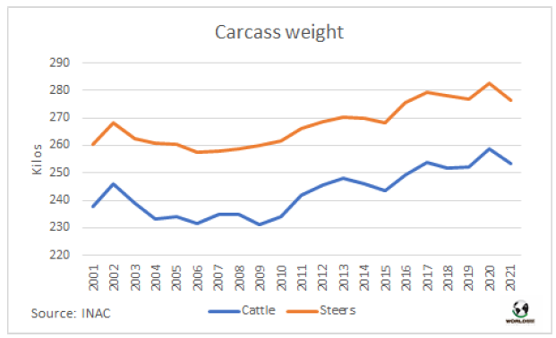 根據(jù)ABC出口商會(huì)的一份報(bào)告,去年待宰牛平均體重有所增加:母牛平均胴體重量為每頭210公斤,公牛的平均胴體重量為每頭246公斤,均高于2020年數(shù)據(jù)。對(duì)于ABC來(lái)說(shuō),由于“穆尼屠宰量減少和較輕動(dòng)物數(shù)量減少”,平均體重為每頭228公斤,比2020年增長(zhǎng)了2公斤。2022年的第一個(gè)月,這一數(shù)值再次被超越,達(dá)229公斤,盡管報(bào)告稱這 “與我們的競(jìng)爭(zhēng)對(duì)手相比仍有很大差距”。