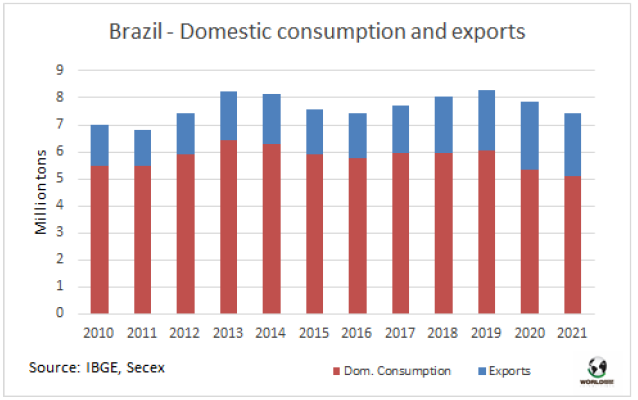 2021年巴西牛肉產(chǎn)量的減少對(duì)出口和國(guó)內(nèi)消費(fèi)均產(chǎn)生影響。據(jù)估計(jì),巴西去年人均牛肉消費(fèi)量509萬(wàn)噸(胴體重量),比2020年減少了27萬(wàn)噸(-5.1%),是自2009年以來(lái)的最低水平。這一數(shù)字是基于IBGE發(fā)布的生產(chǎn)數(shù)據(jù)和外貿(mào)部的對(duì)外貿(mào)易數(shù)據(jù)報(bào)告。相反,如果考慮到人口的變化,檢驗(yàn)機(jī)構(gòu)注冊(cè)的合規(guī)屠宰場(chǎng)(聯(lián)邦、州或市)生產(chǎn)的牛肉的人均消費(fèi)量是自2004年以來(lái)首次降至24公斤以下。由于暫停對(duì)中國(guó)出口,今年最后一個(gè)季度的出口量急劇下降,這意味著海外銷售較去年的下降比例要大于國(guó)內(nèi)市場(chǎng)。出口量減少了7.0%至234萬(wàn)噸,同比減少18萬(wàn)噸(胴體重量)?!?span>