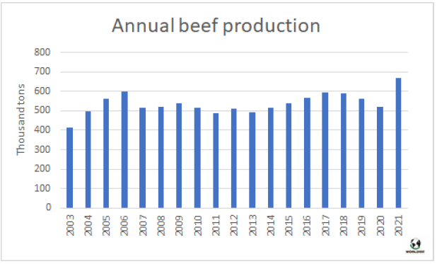 2021年創(chuàng)紀(jì)錄的牛屠宰量決定了牛肉產(chǎn)量大幅增長(zhǎng),達(dá)66.8萬(wàn)噸,創(chuàng)歷史最高紀(jì)錄,同比增幅為28.7%。牛肉產(chǎn)量比2006年的最高紀(jì)錄高出6.9萬(wàn)噸。牛屠宰量較2006年增加了不到5萬(wàn)頭,增幅為1.9%,胴體重量增加了21.8公斤增幅約9.4%,因此牛肉產(chǎn)量比之前的記錄高出了11.5%。