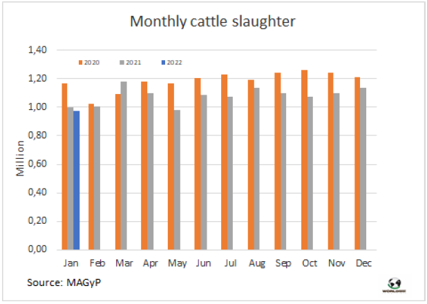1月阿根廷牛屠宰量約97.2萬(wàn)頭,較上月下降了14%,較去年1月下降了3%。2021年五月牛肉出口因罷工被禁時(shí)的屠宰量沒有低于上月。2021年2月至2022年1月牛屠宰量達(dá)1284萬(wàn)頭,同比下降了7%,母牛的比例為45%。