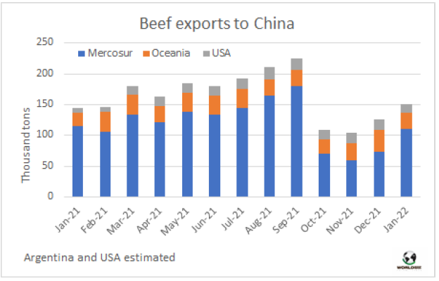 隨著2月中旬中國(guó)市場(chǎng)對(duì)巴西牛肉解禁,巴西對(duì)中國(guó)牛肉出口量穩(wěn)步增長(zhǎng)。據(jù)估計(jì),今年1月,南美洲、大洋洲和美國(guó)向中國(guó)出口了約15萬(wàn)噸牛肉,比去年12月多出了約2.5萬(wàn)噸,比去年11月多出了近5萬(wàn)噸,而當(dāng)時(shí)巴西的牛肉供應(yīng)量幾乎為零。今年1月從南美市場(chǎng)發(fā)運(yùn)的貨物約為11萬(wàn)噸,由于巴西的重新回歸,較上月增加了3.7萬(wàn)噸。澳大利亞和新西蘭1月的出口總量為25761噸,比去年12月的季節(jié)性高峰減少了9500噸。2月,對(duì)中國(guó)的出口量將繼續(xù)增長(zhǎng),接近2021年8月和9月達(dá)到的每月20多萬(wàn)噸的峰值。