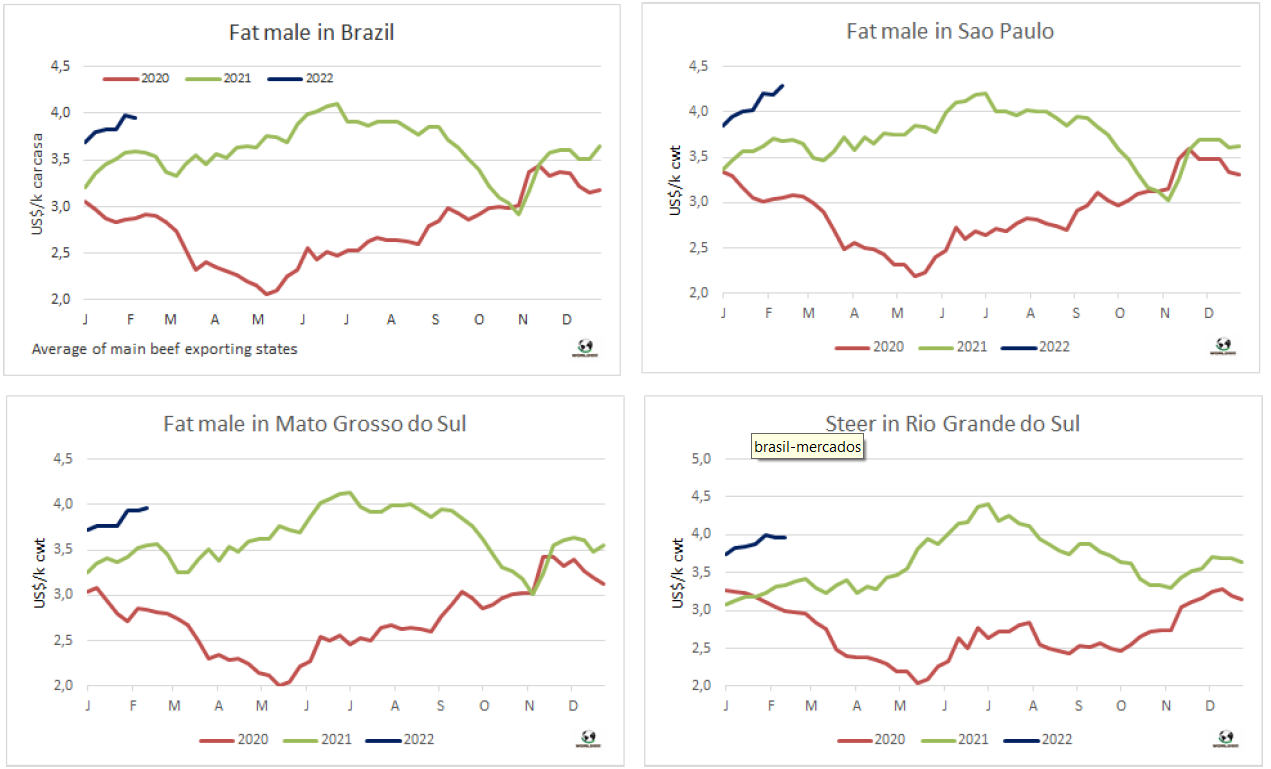 2月前兩周巴西牛肉出口量以驚人的速度增長(zhǎng),價(jià)格也穩(wěn)步上漲。外貿(mào)部報(bào)告顯示,2月的前9個(gè)工作日出口量73446噸,FOB平均價(jià)格5504美元/噸。平均每天的出貨量為8161噸,因此如果保持這個(gè)速度,2月的出貨量將超過(guò)15萬(wàn)噸,比2021年同月高出50%以上。
