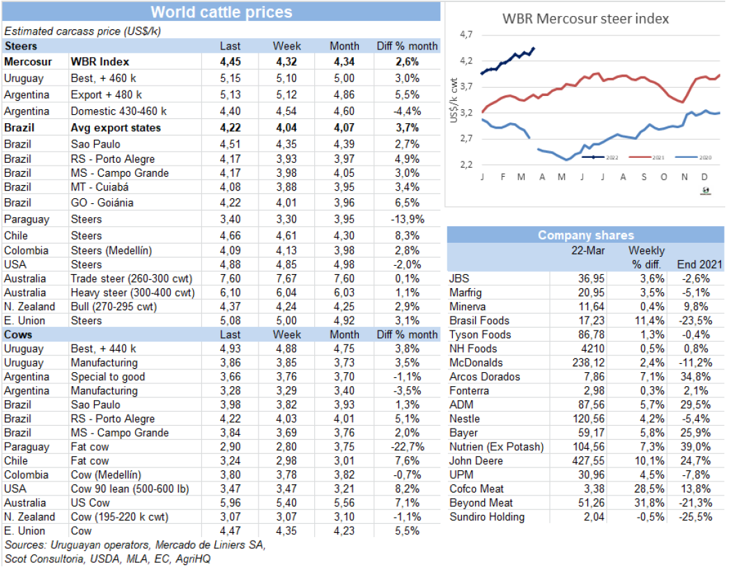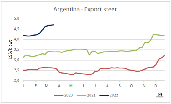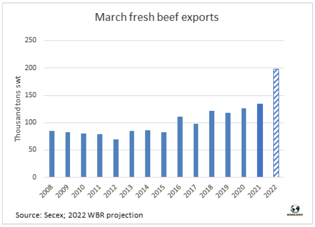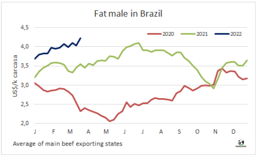 盡管上周牛肉出口速度有所下降,但3月有望成為歷史上巴西牛肉出口量最高的月份。如果在本月剩下的時間里保持這一勢頭,巴西的出口量將超過去年9月(18.7萬噸)的最大值,接近20萬噸。3月的前19天,巴西出口了121028噸牛肉,平均價格為5894美元/噸。這比2021年3月的出口量高出60%,而平均價格較上年增長27.8%。