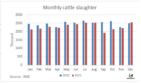 根據巴西地理和統計研究所(IBGE)的數據,巴西活牛生產商2021年屠宰了2754萬頭牛,比前一年下降了7.8%。IBGE在一份報告中表示:“這一結果反映出牛屠宰量連續第二年下降,延續了自2020年初以來觀察到的保留存欄情況。”與去年同期相比,唯一一個屠宰量增加的月份是12月,增加了4萬頭,而降幅最大的是9月,減少了65.1萬頭,由于馬托格羅索州和米納斯吉拉斯州出現了非典型的瘋牛病病例,出口禁運。犢牛平均價格創紀錄的上漲刺激了母牛的保留存欄。2021年全年母牛屠宰的量931萬頭,是自2004年以來的最低記錄?!?今的年牛屠宰數量較2020年減少了234萬頭,27個州中23個州屠宰量都有減少。馬托格羅索州屠宰量下降最為顯著,下降了633.91萬頭。南馬托格羅索州屠宰量減少了43.89萬頭。2021年馬托格羅索州仍以16.2%的占比保持屠宰量領先地位,其次是戈亞斯州(占比10.8%)和南馬托格羅索州(占比10.7%)。2021年第四季度,衛生檢查機構注冊下的屠宰廠屠宰量約690萬頭,較2020年第四季度下降了6.4%,達2008年以來最低。與2021年第三季度相比,屠宰量下降了0.9%。