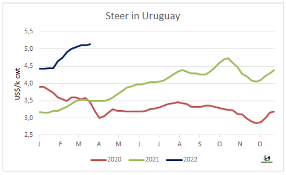 上周屠宰量創今年新高。烏拉圭肉協統計截止3月19日當周牛屠宰量58287頭,較上周增加了6503頭,上周是因為受到大規模罷工的影響。較去年同期增加了僅500頭。所有種類牛屠宰量均有上漲。小母牛屠宰量增長最為明顯,約增長了21%至7143頭。母牛屠宰量增加了17%至22554頭,閹牛屠宰量增加了9%至27432頭。屠宰活動最活躍的工廠是Marfrig Tacuarembo(7廠), 屠宰量5120頭。Las Piedras(379廠),屠宰量4798頭,Pando(439廠),屠宰,4455頭。Marfrig四家屠宰廠屠宰量15606頭,較上周上漲了3182頭,美麗華三家屠宰場屠宰量11791頭,較上周增加了554頭。3月前19個工作日牛屠宰量共計158267頭,較2021年同期增加了0.4%,母牛屠宰量增加了5.1%,閹牛屠宰量減少了3.7%, 2-4顆齒閹牛屠宰量增長了15.1%,占閹牛總屠宰量的60%。