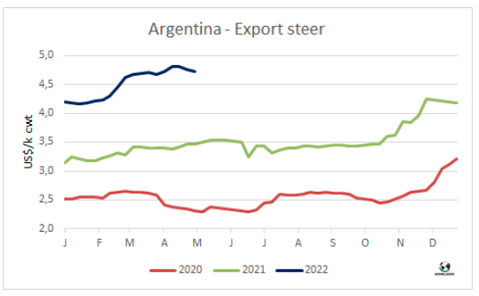 受歐盟價格下降和以色列市場空缺的原因,出口閹牛價格連續兩周保持穩定。質量最好的英國純種閹牛價格在540-550比索之間,澤布雜交品種的價格上漲到510-530比索/公斤,特優母牛價格也保持不變,470-480比索/公斤。主要賣到中國市場的工業母牛最高價下降了10比索/公斤至400-430比索/公斤的范圍。
