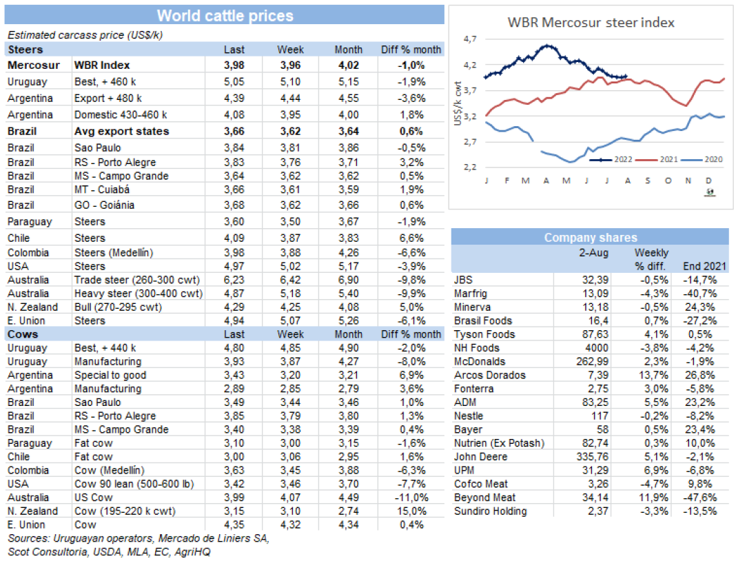 牛屠宰量連續四周走低,本周屠宰量超4萬頭。烏拉圭肉協報告,截止7月30日,一周內牛屠宰量40150頭,環比增加了5008頭,同比減少了1.4萬頭。本周閹牛和小母牛屠宰量增長,主要是歐洲481配額的育肥牛生產需求。閹牛屠宰量21851頭,占54.4%,小母牛屠宰量5478頭,母牛屠宰量與上周保持同一水平,12216頭。屠宰量最高的工廠是Las Piedras,379廠,屠宰量5631頭, NH-BPU,310廠,屠宰量 4089頭和Ontilcor 439廠,屠宰量3996頭。美麗華三家屠宰場屠宰量累計10095頭,Marfrig兩家屠宰場累計屠宰量4174頭。7月屠宰149271頭牛,同比減少8.7萬頭(-37%),是2013年以來七月單月屠宰量最低。2022年前7個月,牛屠宰量累計149萬頭,僅比去年(2.6萬頭)增長了1.8%。五月底累計屠宰量的同比增幅為13.8%(13.7萬頭)。