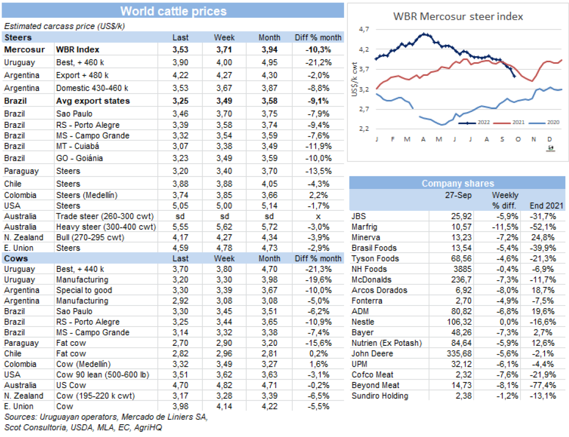 本周牛屠宰量達614日至今14周以來最高。烏拉圭肉協報告,截止924日,一周內牛屠宰量44394頭,較前一周增加了7000頭以上,增幅達19%。仍低于去年同期6353頭。上周屠宰活動低迷的三家工廠中,有2家恢復了屠宰活動,分別是美麗華8廠和MF394廠。MF仍然只有3家工廠在屠宰,55廠仍保持暫停。美麗華3廠仍暫停屠宰。本周母牛屠宰量較上周增加,增幅約45%,達15836頭。閹牛屠宰量增加了10%,至22913頭。本周屠宰量最活躍的工廠是439廠(4821頭),MF12廠(4705頭),379廠(4376頭)。Marfrig屠宰量12013頭,美麗華屠宰量7605頭。本周前24天牛屠宰量138619頭,較2021年同期下降了25%,預計9月牛屠宰量將達18萬頭,較20219月減少約5萬頭。