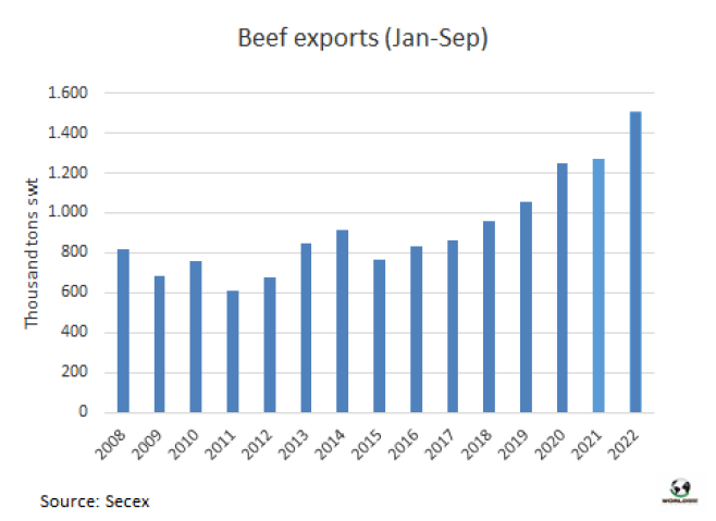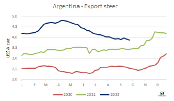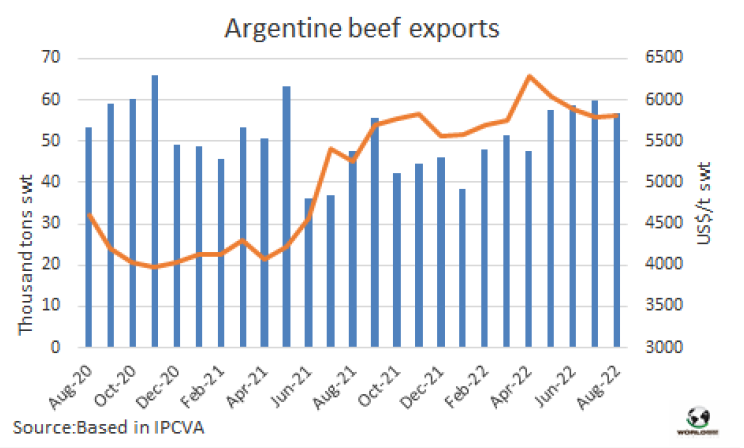 8月阿根廷對中國的出口大幅下降,為4.16萬噸,其中8700噸是帶骨牛肉。冷凍去骨牛肉對中國出口量3.28萬噸,環比下降20%。中國在阿根廷肉類出口中的份額從上個月的82%下降到8月份的73%。阿根廷牛肉出口商會指出:20228月出口到中國的去骨牛肉的平均價格略高于5500美元/噸,與去年5月的5900美元/噸的峰值相比有明顯下降”。