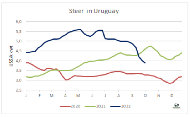 一些在前幾周沒有出現在市場上的工廠從上周中開始重新開始采購草飼牛,質量更好的動物價格更高,這拉大了閹牛的價格差距。近幾周特種閹牛成交價3.9美元/公斤,谷飼牛價格一樣,也有一些成交在4.1美元/公斤,也有工廠出價3.8美元/公斤。重型育肥母牛參考價3.6-3.7美元/公斤。 預定時間7-10天不等,較本月中旬的預訂時間有所縮短。有市場交易者認為供應稀缺,育肥完成的牛一般都已經賣了。烏拉圭南部地區,降雨短缺正引起越來越多的關注,特別是考慮到今年是拉尼娜年,預計都年底降雨低于正常水平的可能性較大。預計市場將開始在接近目前價格的情況下達到新平衡,盡管如果持續不下雨,常規育肥完成的牛的銷售可能會面臨更大壓力。據氣象預報,南部地區下周將有降雨發生。