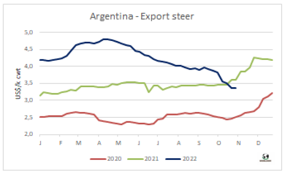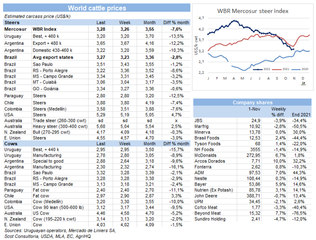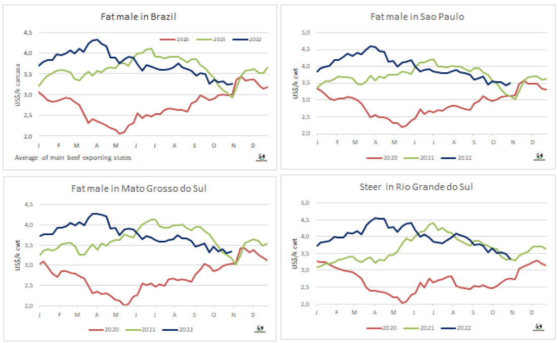 左派總統候選人Lula Da Silva在周日的選舉中獲勝,最初對巴西匯率產生了負面影響,之后雷亞爾升值,從而推高了南方共同市場牛價。本周南方共同市場閹牛價格指數上漲了2美分至3.28美元/公斤,打破了連續三周的下跌勢頭。本周巴西雷亞爾增值2.9%,中和了本地市場育肥牛價格的疲軟,美元價格上漲了4美分至3.27美元/公斤。阿根廷出口閹牛價格繼續下跌,本周下跌了2美分至3.65美元/公斤。烏拉圭和巴拉圭牛價保持穩定,烏拉圭閹牛參考價3.2美元/公斤,巴拉圭參考價2.8美元/公斤。