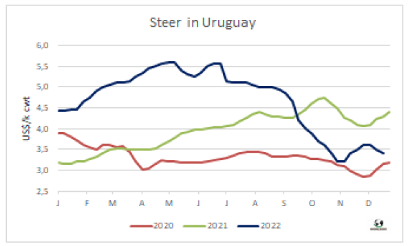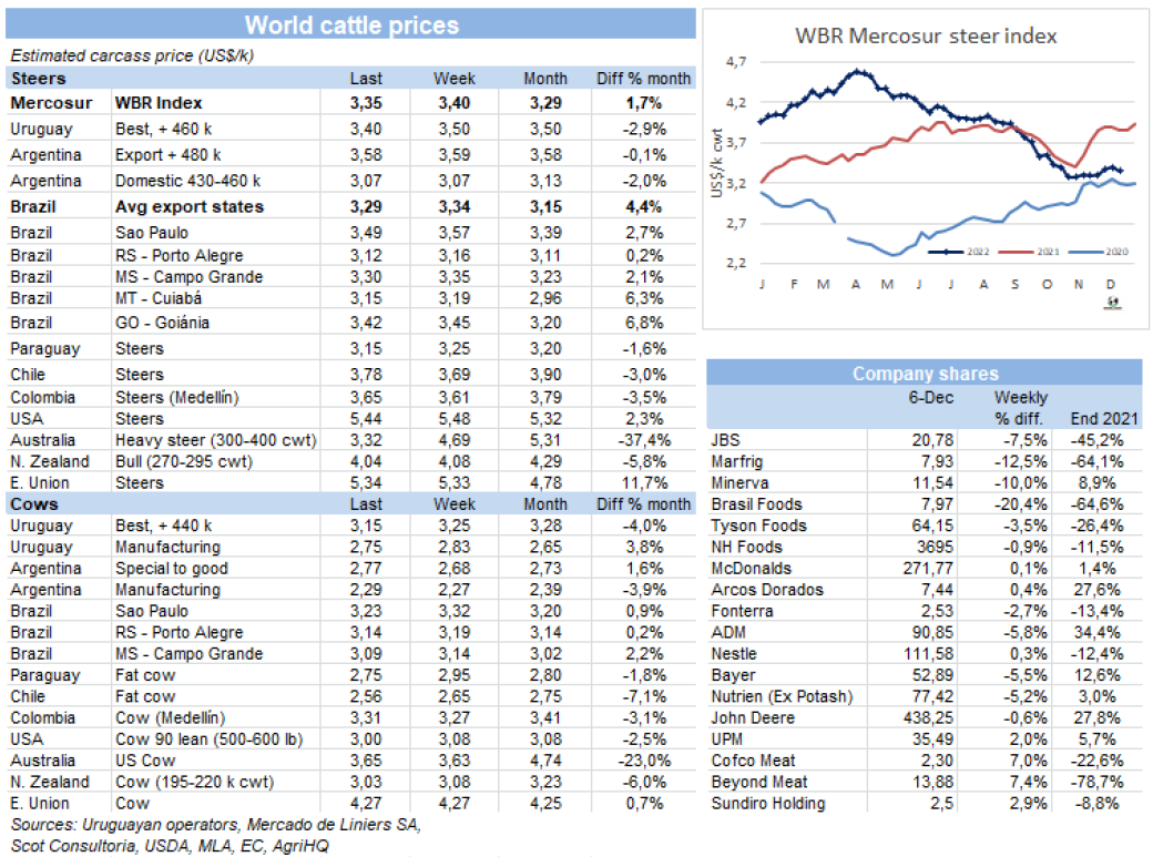 本周南方共同市場閹牛價格指數(shù)下跌了5美分,至3.35美元/公斤。巴西、巴拉圭、烏拉圭牛價走弱,阿根廷牛價保持穩(wěn)定。巴西主要出口州閹牛價格從上周的3.34美元/公斤下跌至3.29美元/公斤,且本周雷亞爾兌美元匯率調貶。