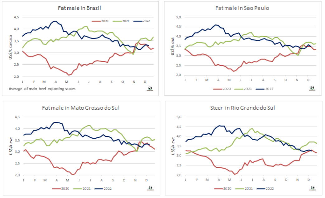 明年受中國需求減弱和供應增加的影響,圣保羅育肥牛價格將低于今年的水平。預計在250-270雷亞爾/15公斤之間波動。分析師稱,明年預計牛價持續(xù)堅挺,隨后價格會下跌。“一些人認為牛價在頂部會趨于平穩(wěn),但事實并非如此。牛周期處于下行階段,2019-2021年期間生產端為提高生產能力進行了大量投資。明年年初牧草漲勢較好將幫助農民賣個好價錢,但分析師認為這種情況不會持續(xù)太久,屠宰端為了應對這種情況已經開始減產。原本幫助抵消國內市場消費下降的出口業(yè)務明年也不會出現(xiàn)2022年的出色表現(xiàn),因為中國作為巴西牛肉的主要出口目的地對進口牛肉的依賴逐步減小。