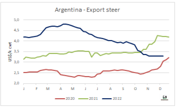 阿根廷出口閹牛價格連續(xù)四周反彈之后,結束了上漲趨勢。這最好的出口閹牛價格報價550-560比索/公斤,本地和澤布雜交牛530-540比索/公斤。特優(yōu)和良種母牛價格仍在490-500比索/公斤,主要賣到中國市場的工業(yè)母牛價格370-430比索/公斤。