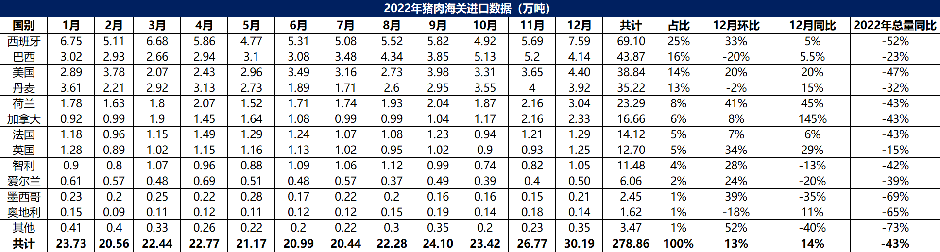 202212月中國主港豬肉進口量30.19萬噸,環比+13%,同比+14%。全年中國主港豬肉進口總量278.86萬噸,同比-43%12月豬肉前四大進口來源國依然是西班牙、巴西、美國、丹麥,分別占當月進口量的25%16%14%13%
