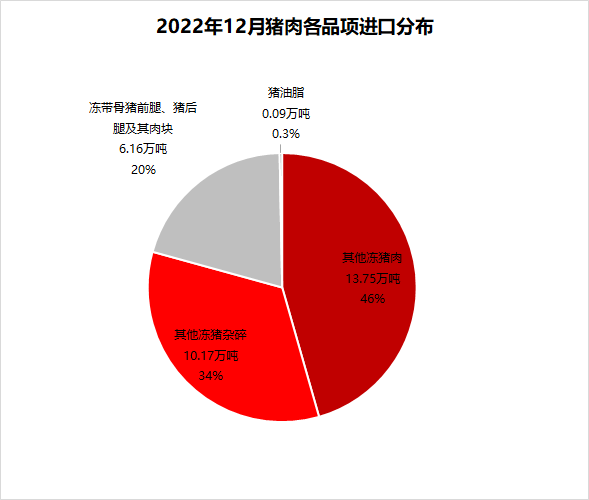 12月豬肉進口品項以骨類和其他帶骨豬肉為主,占進口量的46%;豬副產類占比34%;主塊肉和油脂類占比共計20%