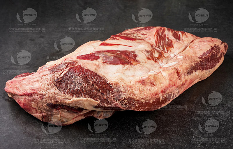 牛前胸肉(Brisket)是位于牛胸口兩肢前腿中間胸脯肉,一面是脂肪,一面是紅色精肉,是牛前腿上端部位的總稱。該部位肌肉通常被脂肪層覆蓋,且富含大量結締組織。