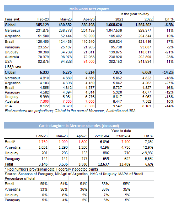 在2023年前四個月,牛肉出口總量為21萬噸(產(chǎn)品重量),價值接近8.95億美元,這一數(shù)字意味著數(shù)量上同比增長13.4%,同時貨值下降17.3%,中國占了發(fā)貨量的77.4%。去年(從2022年5月至2023年4月),肉類出口總量為65.8萬噸產(chǎn)品重量(相當(dāng)于938,500噸帶骨牛肉),價值接近32.73億美元。
