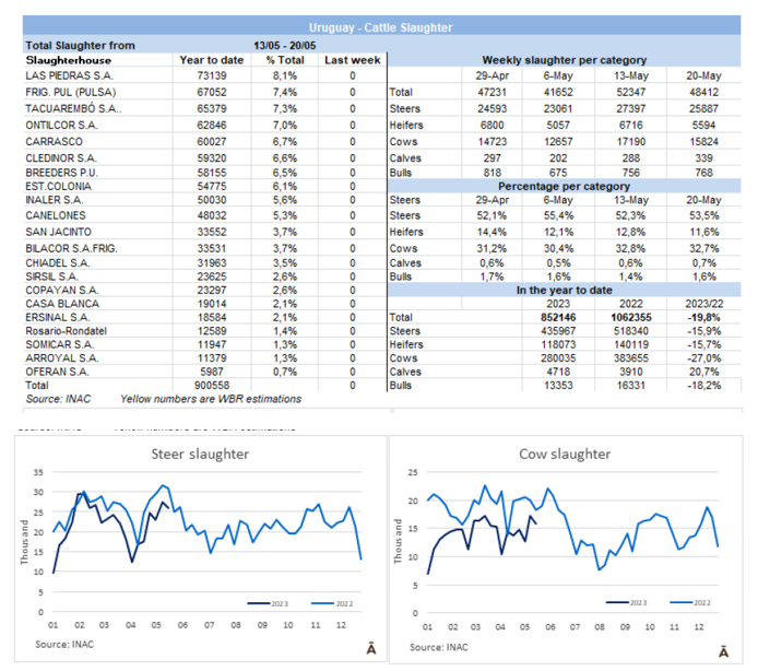 2023年累計烏拉圭的牛屠宰量為852,201頭,與去年同期相比減少了19.4%。
