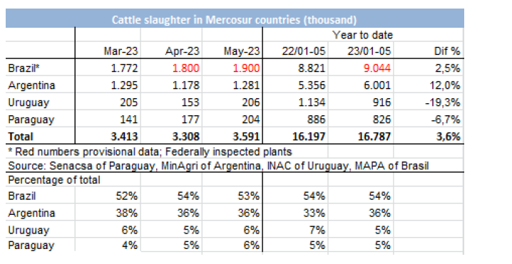根據官方數據顯示5月份屠宰了128萬頭牛,比上個月增長了近9%,年度增長率略高于10%。按工作日計算,5月份的屠宰量超過去年4月份總量的3%,比2022年5月的屠宰量高出16%。雖然在這兩方面的比較中都有增長,特別是同比增長,但與上個月相比有所下降,當時日屠宰量在每月比較中增長11%,同比增長18%。在2023年的前五個月,牛的屠宰量超過了2022年同期。今年共有600萬頭牛被屠宰,比去年同期多12%。