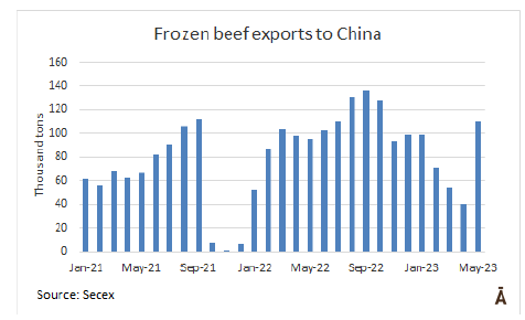 南方共同市場5月份向中國出口了約17.5萬噸牛肉,比4月份多出近8萬噸。反過來,來自大洋洲的出貨量為4萬噸,是三年來最高的月度貨運量,比4月份增加了6.5萬噸。