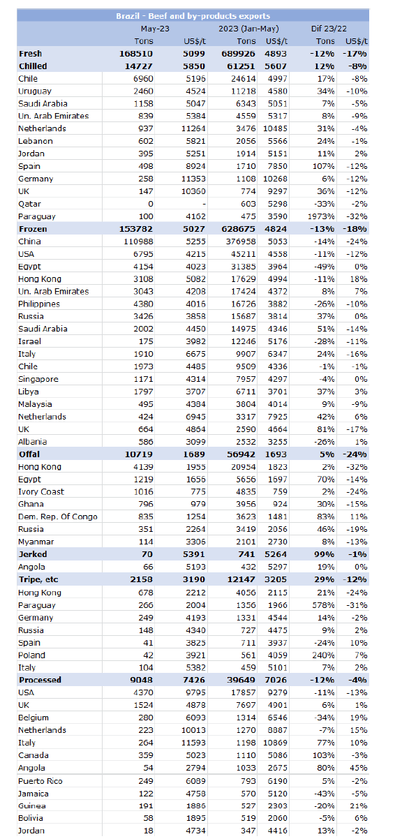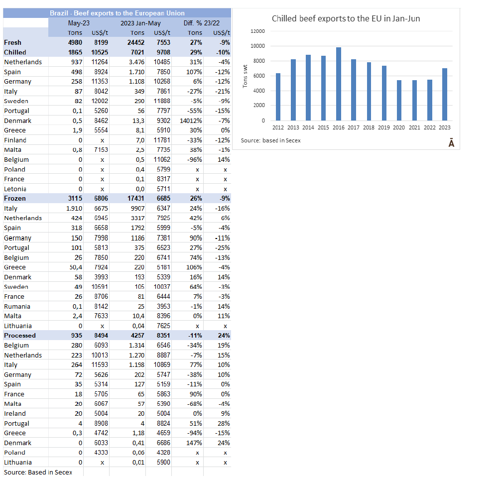 2023年以來巴西對歐盟的牛肉出口量大幅增加,這與國外總銷量的情況相反。在1-5月期間,巴西出口了24452噸鮮牛肉,比2022年同期多27%;冰鮮(增長29%)和冷凍(增長26%)的出口都有所增加。荷蘭在巴西鮮牛肉出口中占主導地位,其次是西班牙,而意大利在巴西冷凍牛肉出口中基本占主導地位,是總數量的57%。