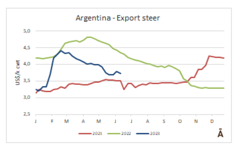 阿根廷由于貨幣貶值,出口閹牛的美元價格下跌$0.06至$4.06/公斤。
