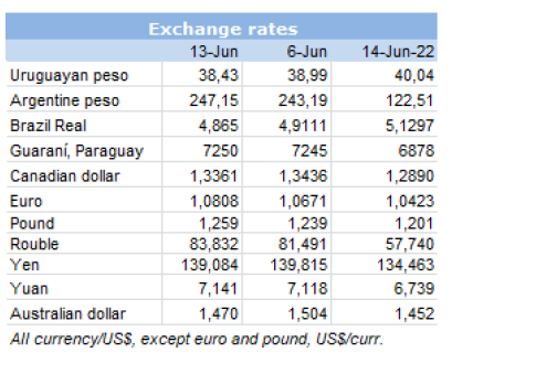 市場價格持續下跌。一位貿易商舉了一個例子,烏拉圭當時以$5500的CFR價格出售,兩天后每噸下降了$500,而本周的出價是$4800。在付款時要格外小心,因為進口商損失是巨大的,庫存的產品價值比目前的市場價要高得多。