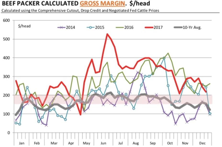 下附兩張圖表描繪了貿易商在開年的利潤率的不同情況。牛肉貿易商的利潤率在很大程度上被壓縮到今年年初,部分原因是寒冷的天氣對牛群的影響。在2017年,牛肉貿易商的利潤率非常好,對2018年的利潤率也仍然保持十分穩健的預期。但是通常一季度的利潤都很低,今年也不會是個例外。當所有牛肉需求呈良好態勢,牛供應將持續增加,也會驅動對牛肉分銷服務的需求。在最近兩周牛肉貿易商的利潤率被擠壓,我們認為2017的最后一周的利潤率非常接近于盈虧平衡點。如果精選級牛部位肉價格保持在205美元這個范圍,貿易商會支付120美元去買牛,剩下的也就接近盈虧平衡,而沒有賺到一點錢。生豬貿易商在開年的利潤率通常都很高。假期縮短的周數往往使生豬利潤率延遲,在開年會有一個很大的需求,而這個需求伴隨著市場積壓庫存的清空。寒冷的天氣并沒有對生豬造成多大損失, 因為都被移置于室內喂養,牛的情況也是如此。在產品方面,貿易商也非常頭疼節后后腿需求的暴跌。在這種情況下,生產商會為了保持生豬的流通運轉而提供給貿易商一個足夠大的利潤空間。這個庫存積壓的問題往往能被相當快的解決。在1月的下半月我們應該會看到一個更加正常的市場狀態。接下來的挑戰是豬肉在國內和國外渠道中的需求。期貨市場現在的價格走勢呈現出了在這個冬季和早春對豬肉的積極需求。去年我們看到了對豬部位肉和生豬需求的顯著激增,此趨勢一直持續到2月。這也很大程度上歸功于豬五花的高位價格。后腿價格最近持續疲軟,我們正看到更多的產品在現貨市場交易。和墨西哥的貿易持續穩定,現在較低的后腿價格應該能持續助力外銷。今年冬天期間生豬疾病的壓力是一個問題,一些報告顯示,豬藍耳病和豬流行性腹瀉病病例在增加。但情況與我們過去兩年看到的情況類似,目前尚未有太多影響。