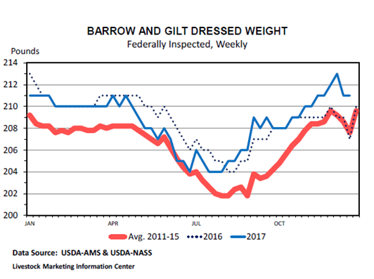 2017年生豬屠宰量依然跟隨著季節性模式。在2017第四季度年同比增加也是通常的典型情況,并高于同期前幾個月水平。11月和12月上半月溫和的中西部天氣能有利于提高育肥重量。生豬重量在2016年年底出現異常,年同比并沒有增加(或者說是相較于前5年的平均水平也沒有增加,請見圖表)。
