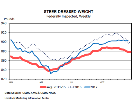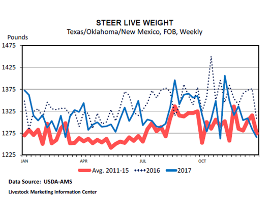 根據最新數據,牛的育肥重量在2016年最終有一次上浮,部分原因是從11月到12月溫和的天氣。作為提醒(在今天日報里的一個部分也提及到),2017年年初育肥牛的重量年同比下降不能都歸結為惡劣的天氣。積極擴張的市場營銷也導致了這些下跌。但12月底幾個主要育肥場的所在地區天氣發生改變,極度寒冷的天氣突然到達美國中西部和一些其它地區。后附兩張育肥牛重量趨勢圖片相比, 顯然12月的年同比重量增加主要是在中西部和中部平原地區。近期極端寒冷的天氣主要集中在美國中部,預計國家育肥牛重量數據能很快體現出來。