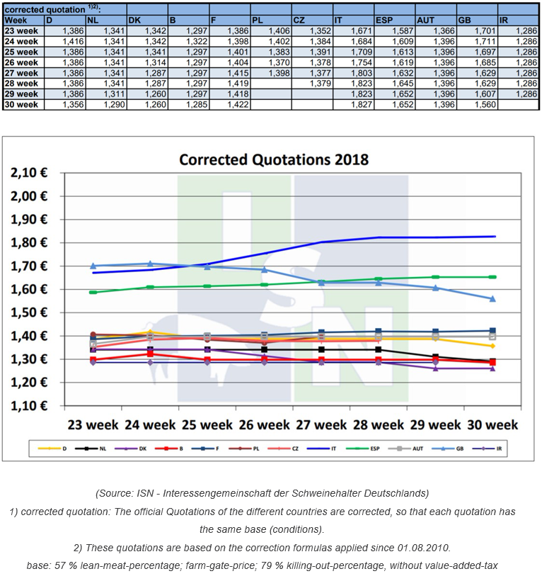 德國的豬價也面臨壓力,豬價下跌3歐分,據稱是由于假日肉類交易疲軟導致的。德國屠宰量已經低于900,000頭,較去年下降很明顯。歐洲南部地區豬價沒有明顯下降,意大利和西班牙假期需求增加。