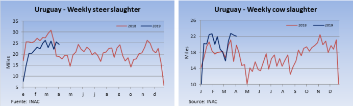 三月出口歐盟冷鮮市場牛肉價格持續下行趨勢,均價6935美金,20099月以來新低,自20186月,也就是九個月以來跌了25%,同時出口量也急劇減少,第一季度只出口3751噸,同比減少28%。因為歐洲市場價格劇跌,相比巴西國內市場已經沒什么優勢,所以巴西工廠沒有太多意愿出口,尤其歐盟對可追溯性要求還很嚴。