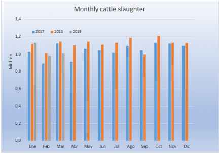 2019年第一個月牛只屠宰量超過前兩年,但是后面兩個月屠宰量同比下跌,三月只屠宰了101萬頭,第一季度總共屠宰312萬頭,同比減少5%