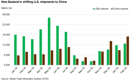 一月美國進口牛肉量同比增加2%,達到2.53億磅,除了新西蘭其他主要供應國都有增加,新西蘭進口量同比減少了36%,自2012年以來最低,主要因為產量減少,再加上出口亞洲的量增加。預計2019年美國牛肉進口量30.1億磅。