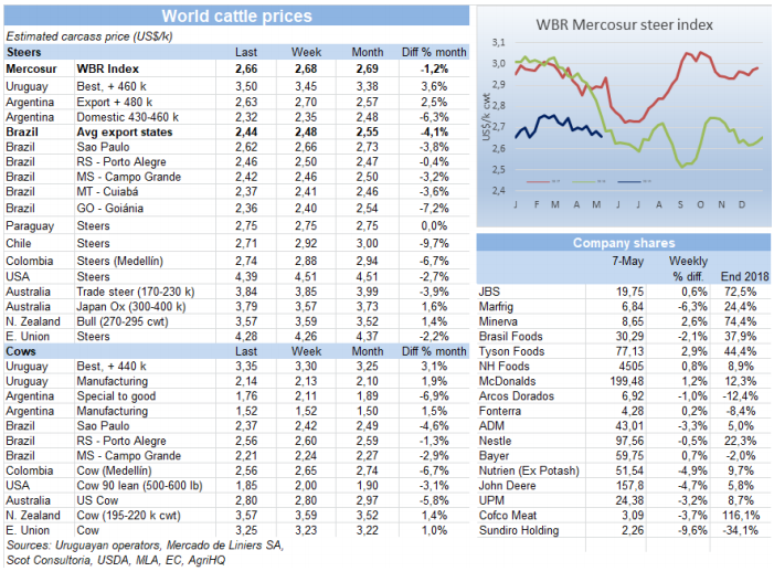 中美貿(mào)易戰(zhàn)升級影響了南美各國貨幣匯率,拉低了美金牛價,本周南方共同市場閹牛指數(shù)跌了2美分到2.66美金/公斤,在特朗普發(fā)推威脅加征關(guān)稅之后,阿根廷比索和巴西雷亞爾都有貶值,比索貶值4.2%,雷亞爾貶值1.6%,因此巴西育肥牛跌了4美分到2.44美金,阿根廷閹牛跌了7美分到2.63美金,烏拉圭活牛進(jìn)一步短缺,價格再度上漲,達(dá)到3.5美金,巴拉圭牛價連續(xù)三周不變,保持在2.75美金。