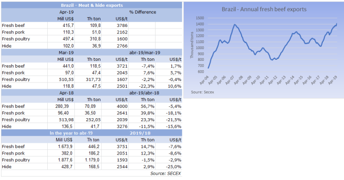 截止到四月的12個月內(nèi),巴西共出口141萬噸牛肉,創(chuàng)下了12年前2007年五月創(chuàng)下的139萬噸的記錄。四月巴西出口了109804噸牛肉,均價3786美金離岸價,雖然量比三月底,但遠(yuǎn)超去年四月,去年五六月由于運(yùn)輸罷工,出口量很低,所以今年五六月份有望繼續(xù)突破連續(xù)12個月的出口量記錄。目前巴西已經(jīng)連續(xù)十個月出口量超過10萬噸。