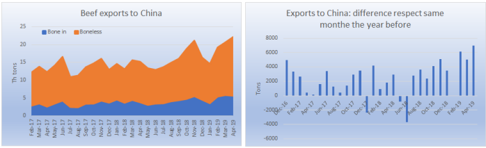 四月烏拉圭牛肉出口量32402噸,其中22165噸去中國,占比68.4%,新歷史紀(jì)錄,其中2644噸冷鮮和29758噸冷凍牛肉,均價分別為9047和4680美金/噸,出口中國的量同比增加46%,今年前四個月中國分別進(jìn)口了20378噸帶骨和56283噸去骨牛肉,同比分別增加23%和33%。美國市場也很活躍,年初價格漲了很多,四月共進(jìn)口3796噸牛肉,今年前四個月進(jìn)口12731噸,同比增加16%。