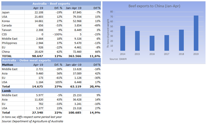 2019年前四個月澳洲對中國出口72460噸牛肉,同比增加66%,至此中國成為澳洲牛肉第三大市場,接近美國7.96萬噸和日本8.78萬噸。四月澳洲共出口98647噸牛肉,連續(xù)16個月同比增加,前四個月共出口36.3萬噸,同比增加11.6%。前四個月綿羊肉出口量也增長了20%,達(dá)到63119噸,羊羔肉出口增長15%到100685噸。