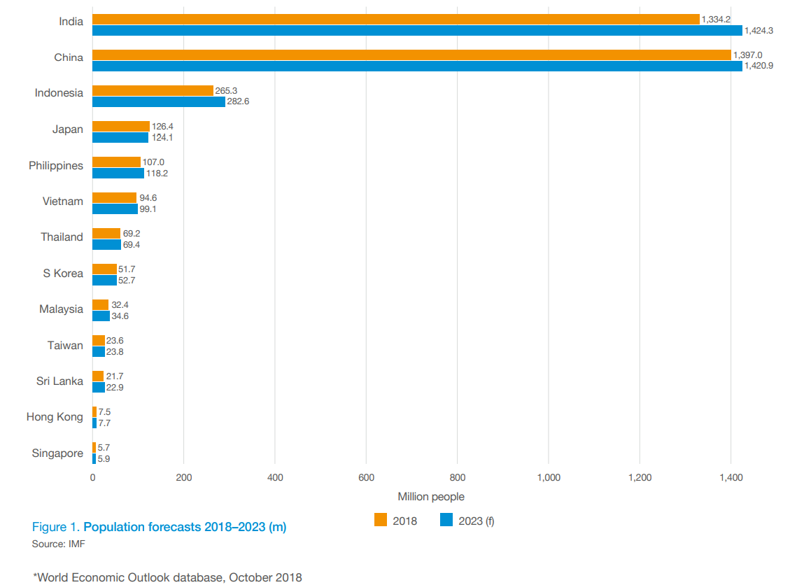 2009年全球中產(chǎn)階層18億人口,2020年預(yù)計達(dá)到32億人口,2030年預(yù)計達(dá)到49億人口,中產(chǎn)階層增長主要來自亞洲,約占全球中產(chǎn)的66%,占2030年中產(chǎn)階層消費(fèi)總量的59%。人口只是分析市場潛力的一個因素,其他因素比如:收入增長和文化影響,可能更重要。盡管印度有望成為人口第一大國,但印度的肉類年人均消費(fèi)僅3.3公斤,其他亞洲市場對于出口商來說更具吸引力。(圖一:2018-2023年人口預(yù)測(單位:百萬))