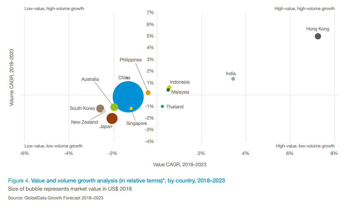 2017年AHDB調(diào)研結(jié)果顯示52%的日本受訪者選擇保質(zhì)期作為判斷肉品質(zhì)量的第一選擇。圖五圖表顯示冷凍肉無論是數(shù)量還是數(shù)額未來都將是增長幅度最大的。(圖五:2018-2023年肉類結(jié)構(gòu):亞太地區(qū)市場數(shù)額和數(shù)量增長分析)