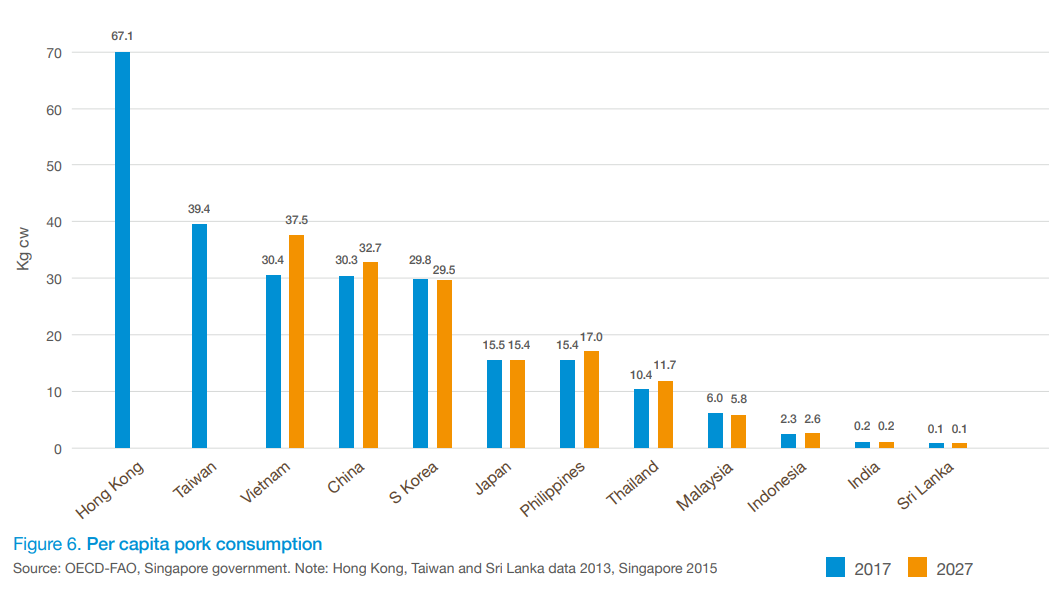 到2027年預(yù)計越南豬肉和牛肉消費(fèi)增長幅度最大,中國羊肉消費(fèi)增長幅度最大。(圖六-八:豬肉/牛肉/羊肉人均消費(fèi)量)