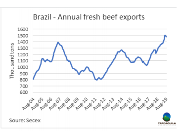 巴西鮮牛肉出口量仍處于較高水平,但不足以與過去幾年出口量持平,出口上漲趨勢可能達到了150萬噸年度最高,此后可能輕微下行。八月巴西出口鮮牛肉126506噸,低于七月出口量12.9萬噸和去年8月出口量14.4萬噸。平均出口價格4178美元/噸,比七月出口價格增長5%,創(chuàng)13個月以來新高。巴西八個月合計出口93.4萬噸鮮牛肉,平均出口價3872美元/噸,出口量年度增長15%,平均價格減少9.5%。